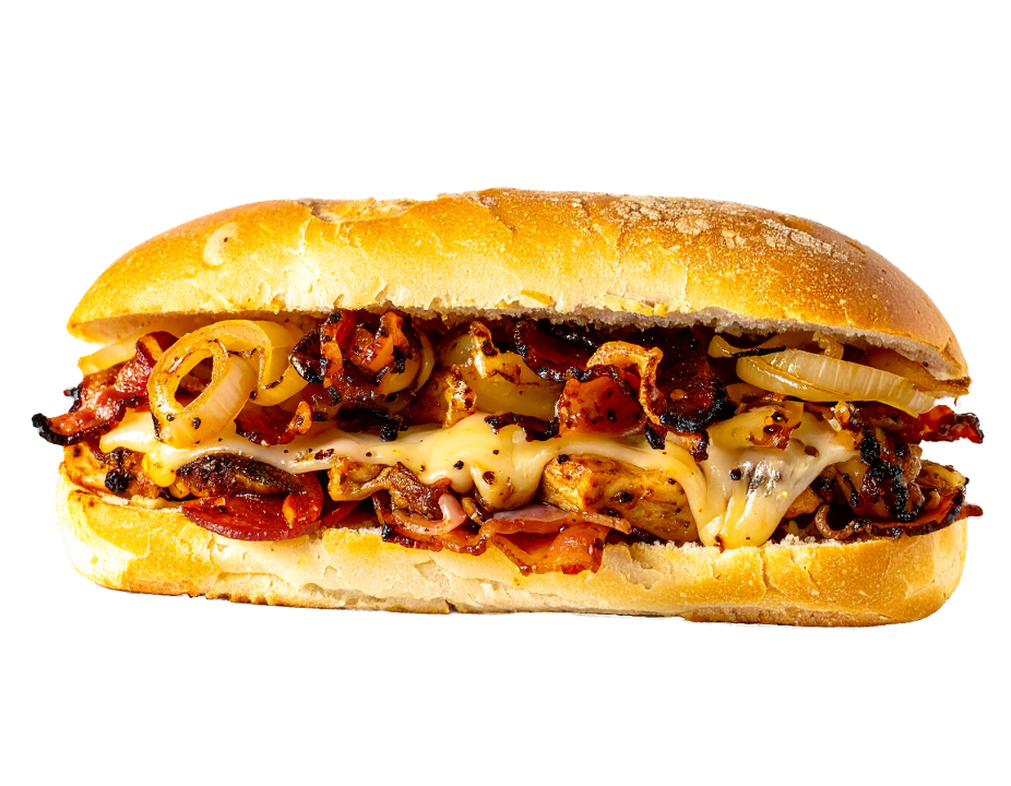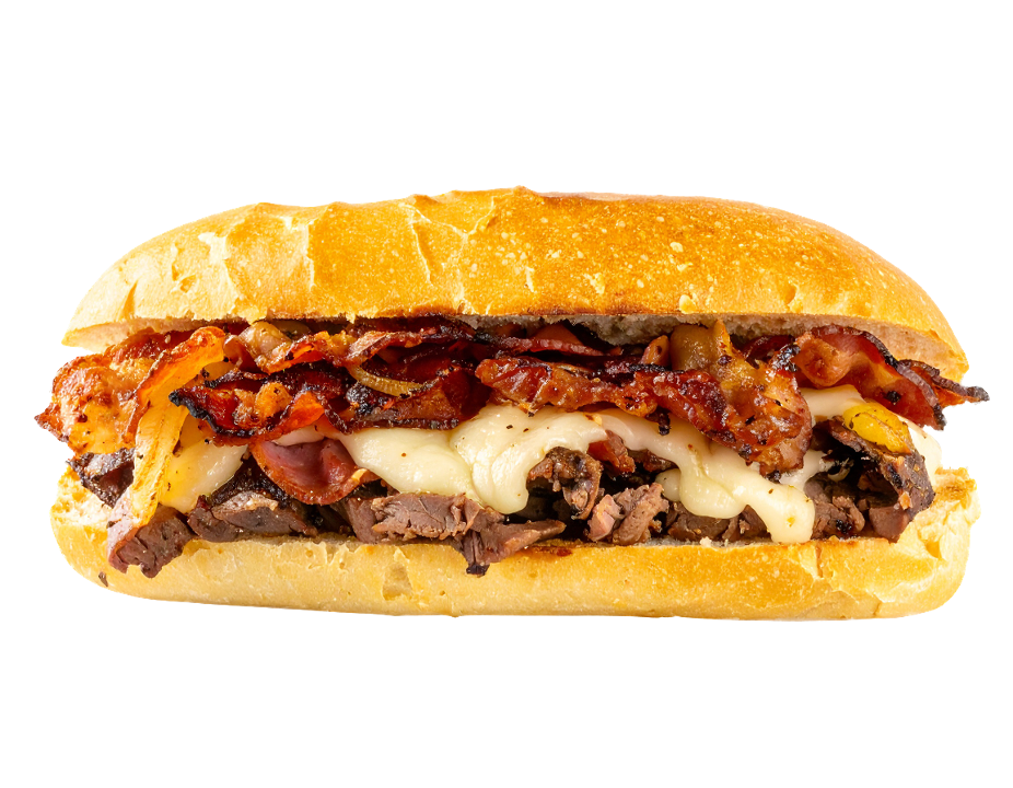 Lean steak with onions, bacon, cheddar cheese and mayo.