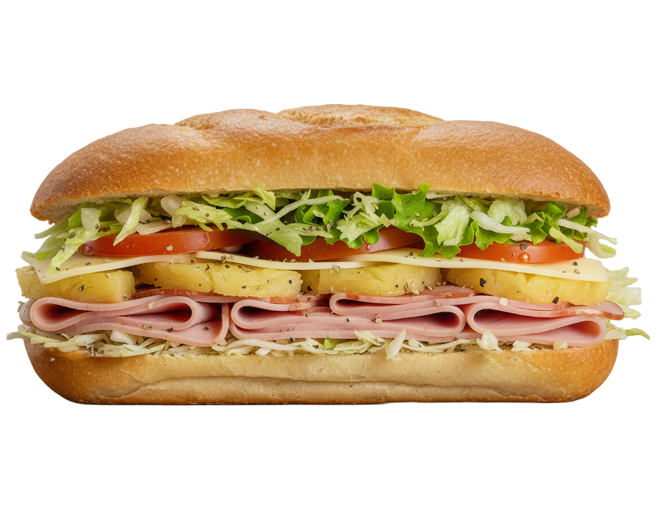 Black forest ham with Swiss cheese, pineapple, mayo, lettuce, tomato slices, onions, oregano and pepper on a fresh baked roll