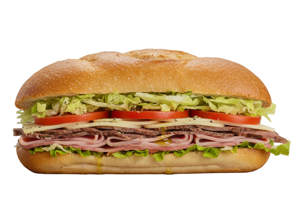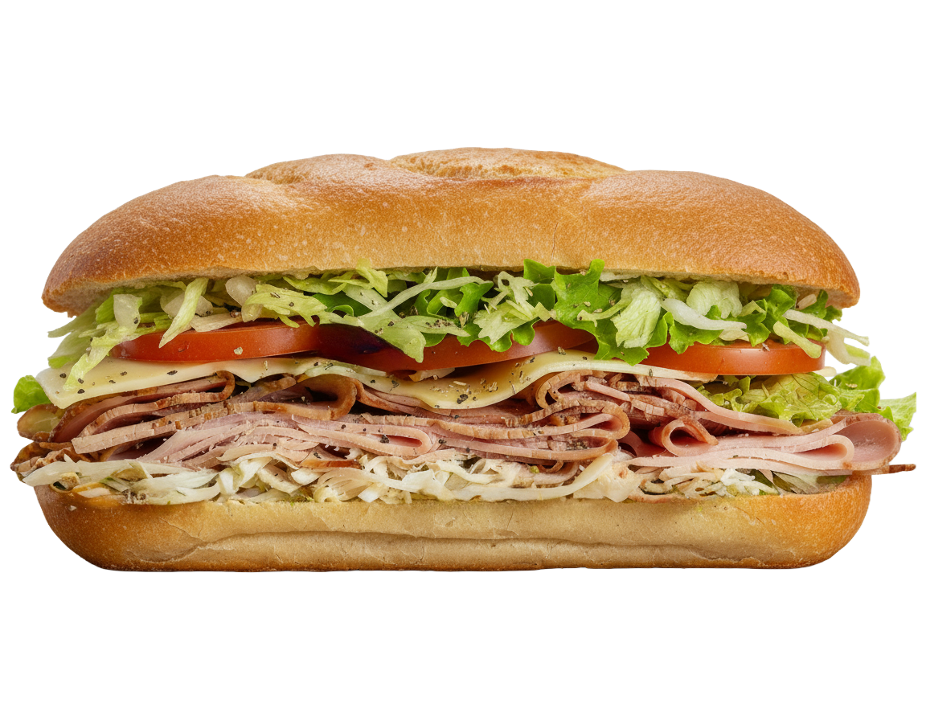Sliced pepperoni, salami and black forest ham with provolone cheese, mayo, lettuce, tomato slices, onions, zesty Italian dressing, oregano and pepper