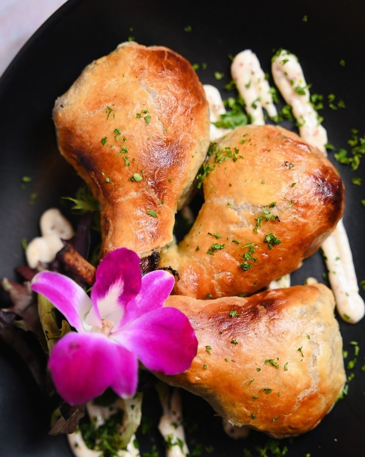 chef q's house spices | stone ground mustard | sweet carrot puree | duxelles | puff pastry