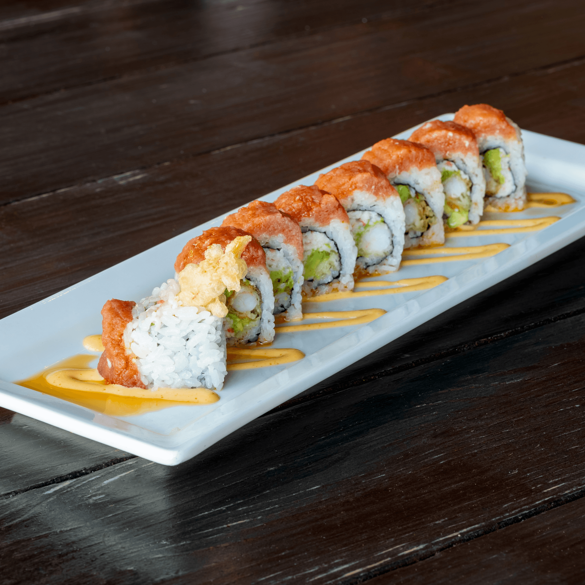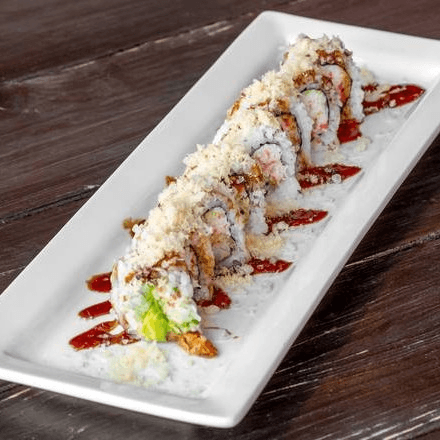 Shrimp tempura, avocado & crab mix. Topped with unagi sauce & tempura crunch