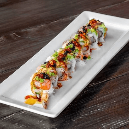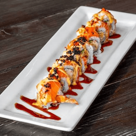 Spicy crab mix, shrimp tempura & avocado. Topped with salmon, ebi shrimp, spicy mayo, unagi sauce & masago