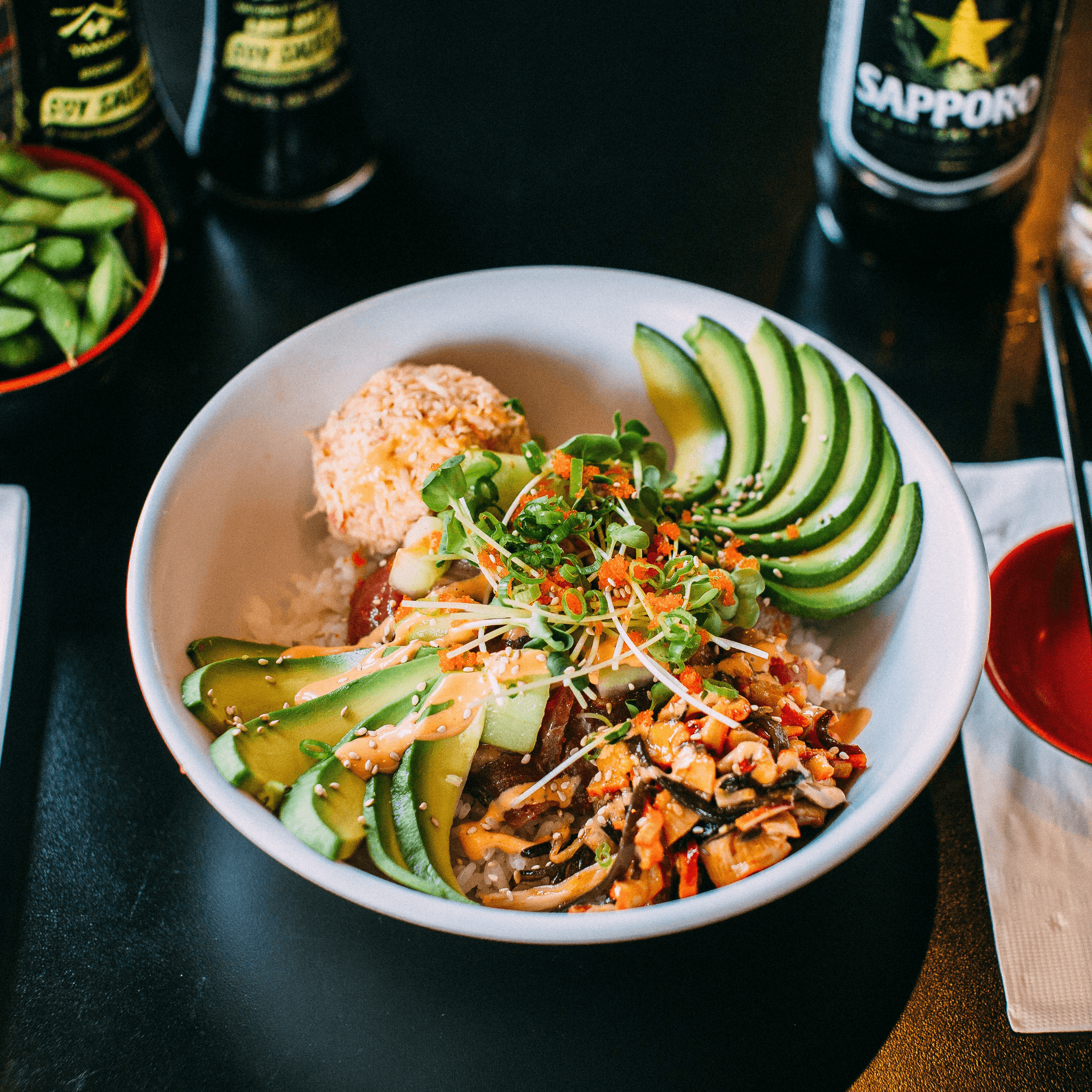 Marinated fresh salmon, tuna, yellowtail, albacore, & spicy squid. Topped with crab mix, avocado, pickled cucumber, masago, sesame seeds, and our poke sauce blend. Served over rice and/or spring mix