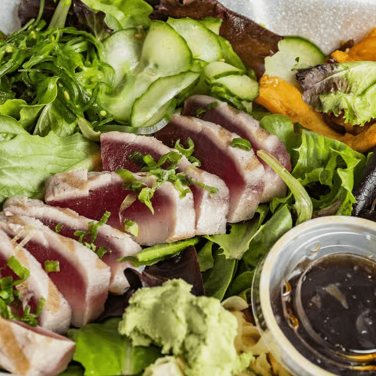 Seared tuna on top of spring mix. Garnished with spicy squid, cucumber, seaweed, and ponzu sauce