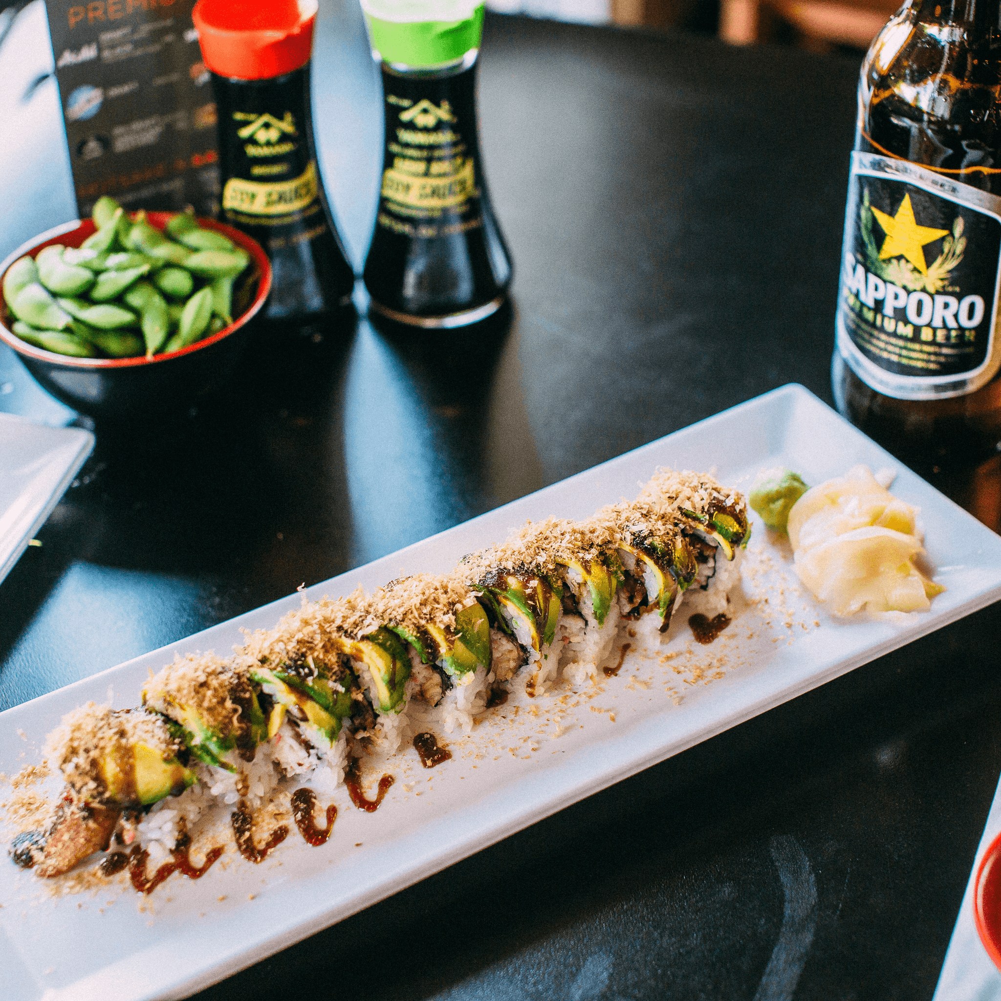 This roll is 'Winning'! Flash-fried hamachi on top of nori-wrapped snow crab, spicy tuna & avocado. Drizzled with sesame dressing, unagi sauce & spicy mayo. Wrapped in soy paper!