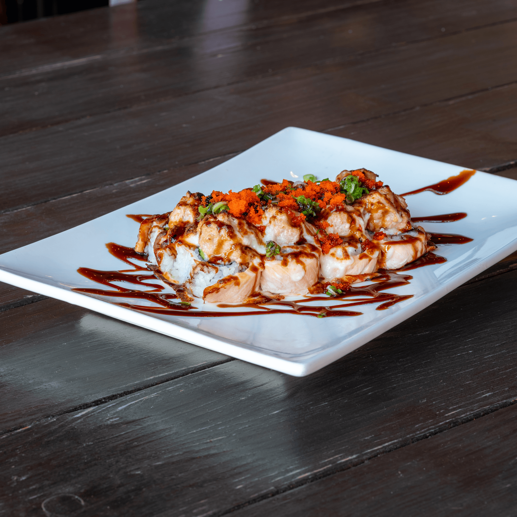 Fresh salmon on top of shrimp tempura, crab mix & avocado. Drizzled with spicy mayo & chili oil