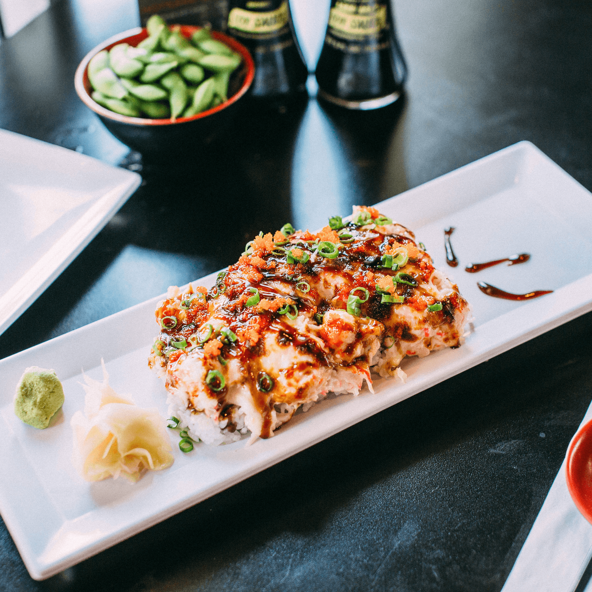 The king of our rolls! Seared kobe beef on top of shrimp tempura, crab mix & avocado. Topped with cilantro mix, masago & kan-pai dressing. Served with a side of fresh wasabi