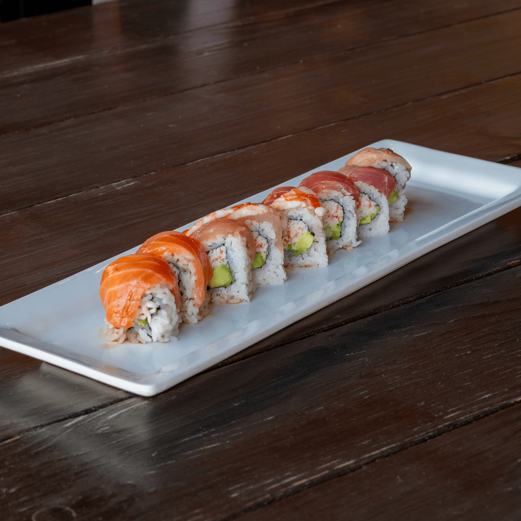 5 types of fish (tuna, salmon, albacore, yellowtail, ebi shrimp) on a Cali roll with kan-pai dressing