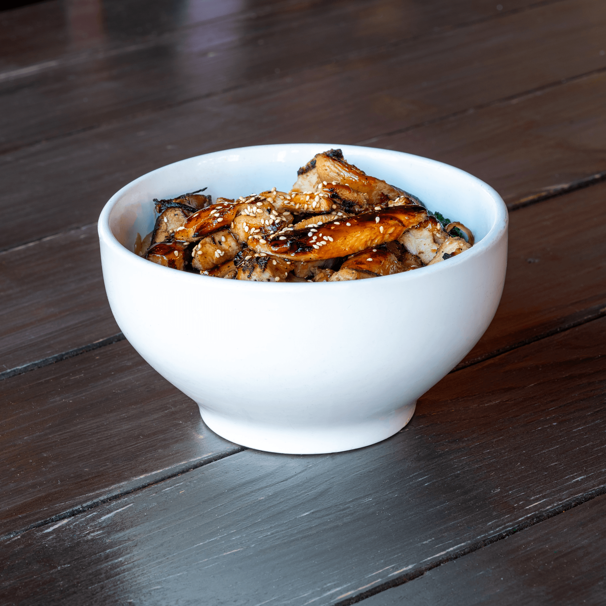 Pan-fried chicken thigh roll with a bed of teriyaki veggies. Topped with house teriyaki sauce