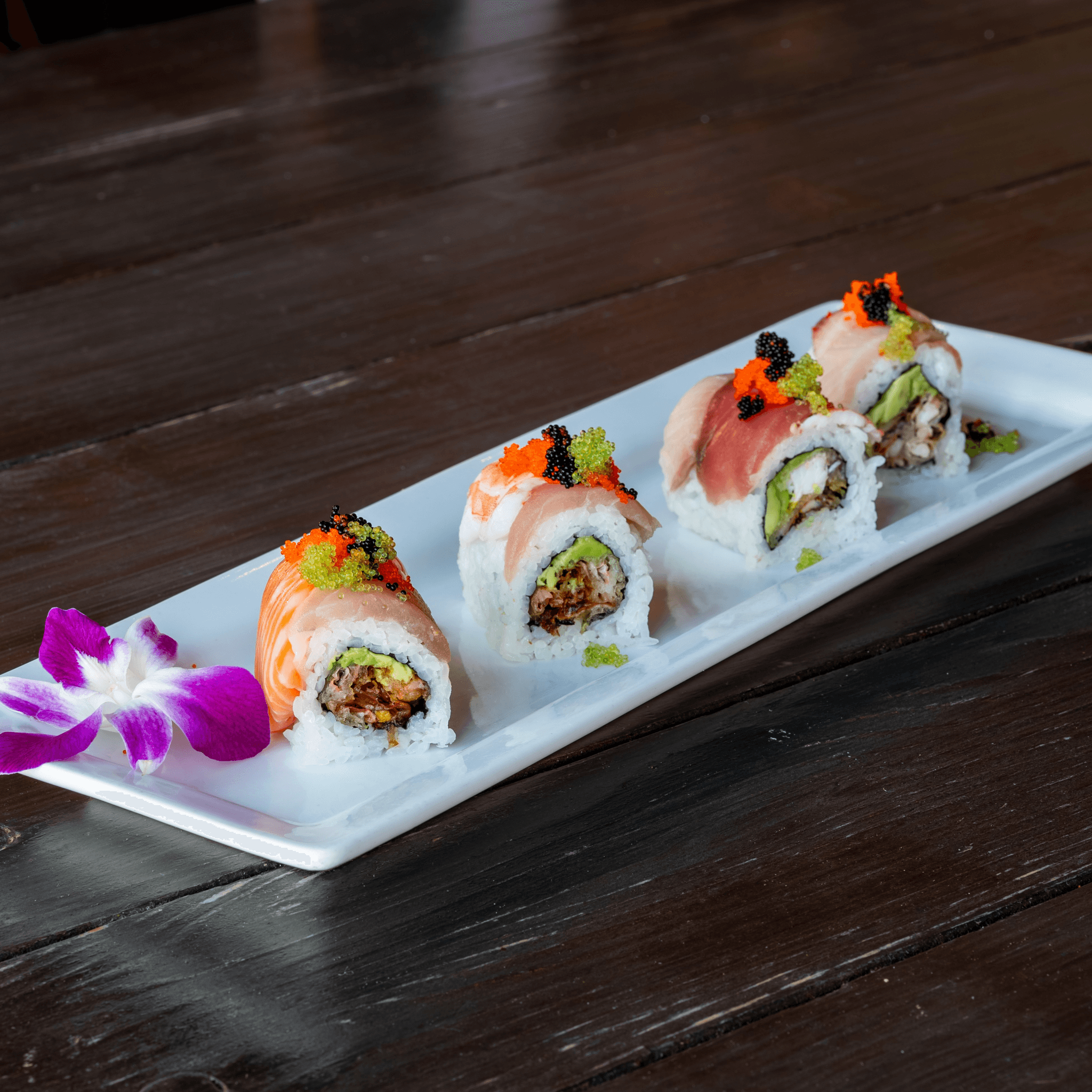 Fresh tuna & salmon on top of spicy tuna, crab mix & avocado. Garnished with thin lemon slices, tobiko, ponzu, kan-pai, chili oil & goma dressing