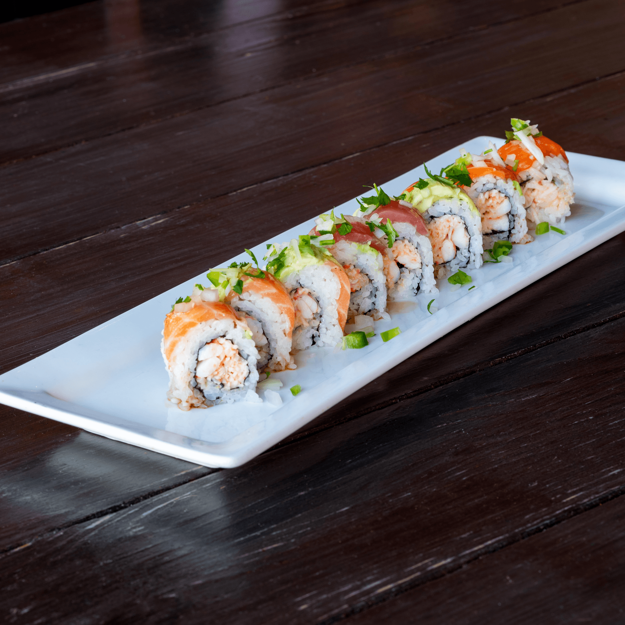 Crab mix and cucumber topped with hamachi, avocado, and green onion. Drizzled with kan-pai dressing and fresh wasabi