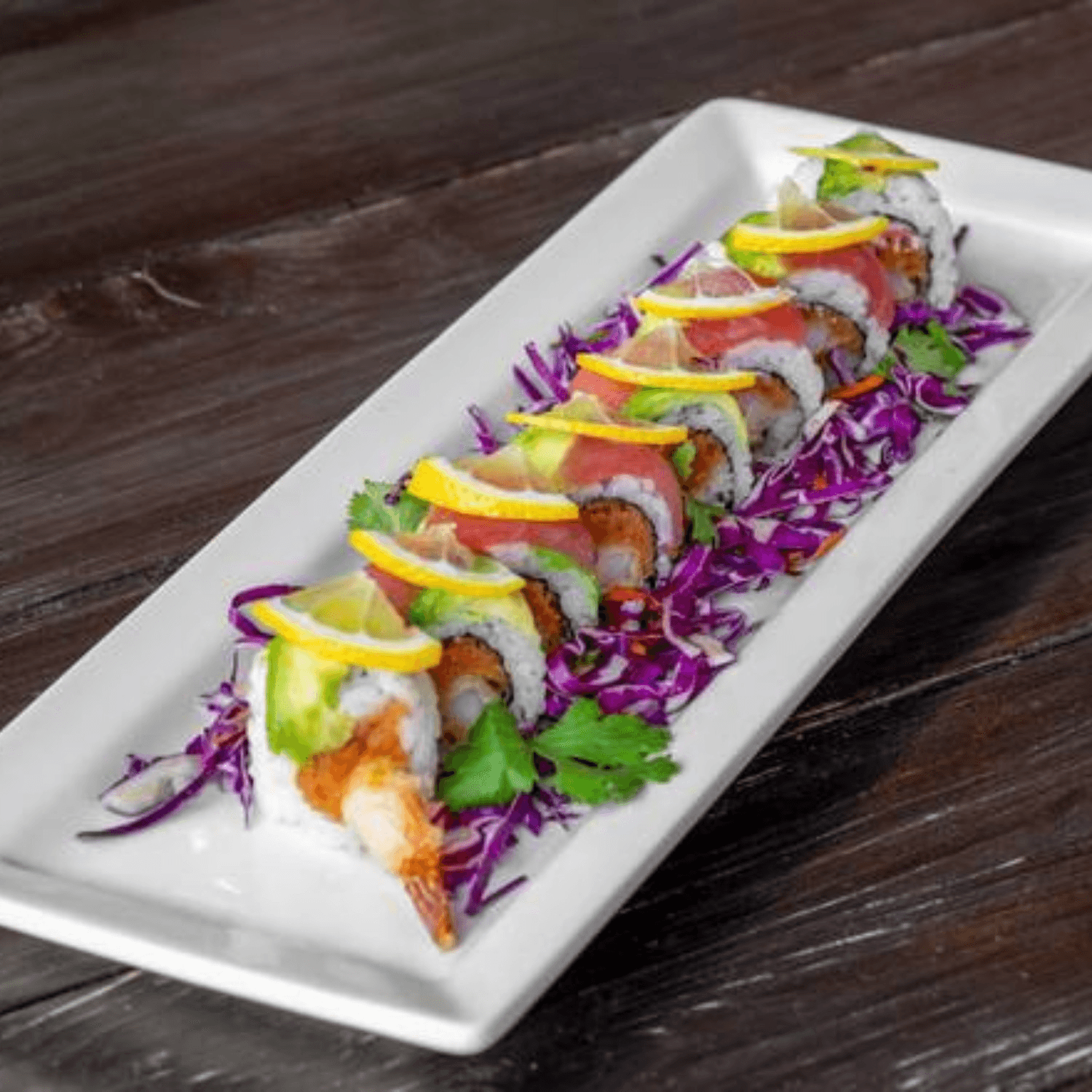 Shrimp tempura, spicy tuna, crab mix & sprouts. Topped with tuna, avocado, cilantro mix, thin lemon slices & kan-pai dressing
