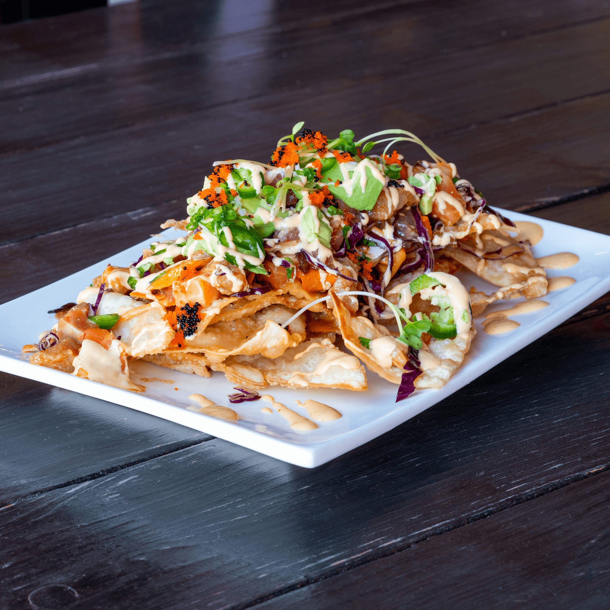 Marinated fresh fish and spicy squid with avocado, green onion, masago, jalapeños, seaweed strips, sesame seeds, and cilantro mix. Drizzled with Omakase's poke sauce blend and spicy mayo, all on a bed of crispy wontons!